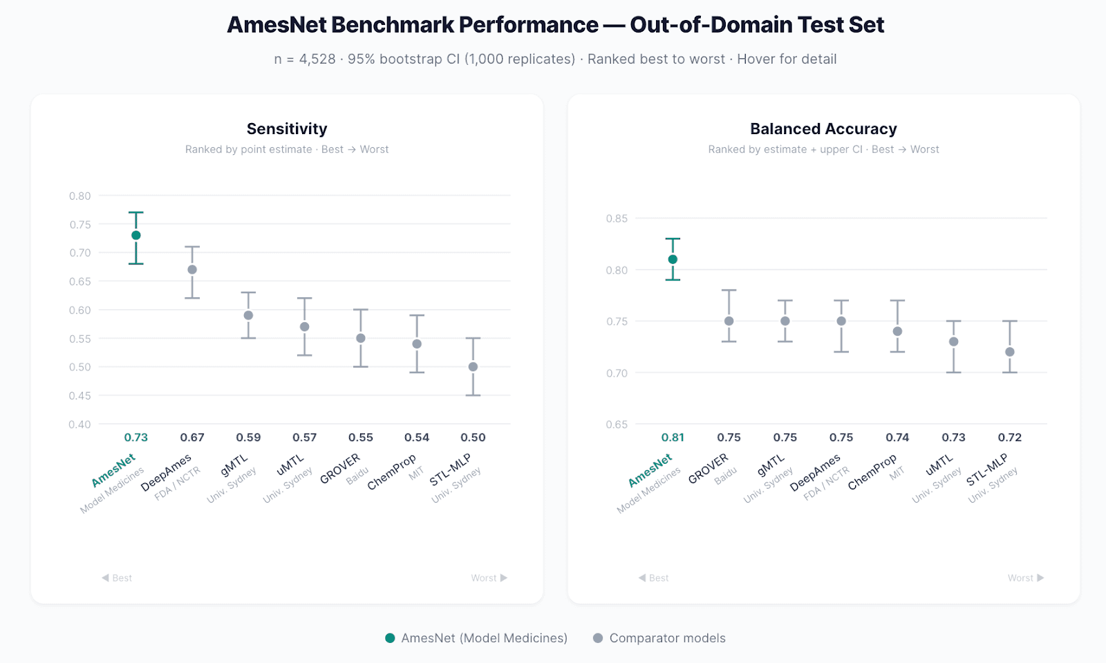 Best-in-Class Performance: AmesNetTM achieves a sensitivity of 0.73 and a balanced accuracy of 0.81 on out-of-domain test data (n = 4,528). A sensitivity improvement up to 46% over existing approaches.