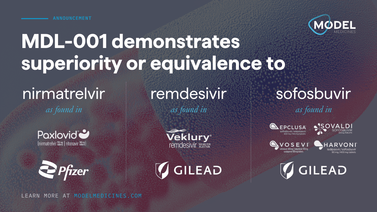 San Diego, Calif. — Model Medicines, a leading generative AI biotech, today announced a major milestone in antiviral drug development, pandemic preparedness and biodefense: its lead candidate, MDL-001, has demonstrated in vivo superiority or equivalence to three current standards of care (Nirmatrelvir, Remdesivir and Sofosbuvir) in both acute respiratory and chronic hepatic viral infections.
